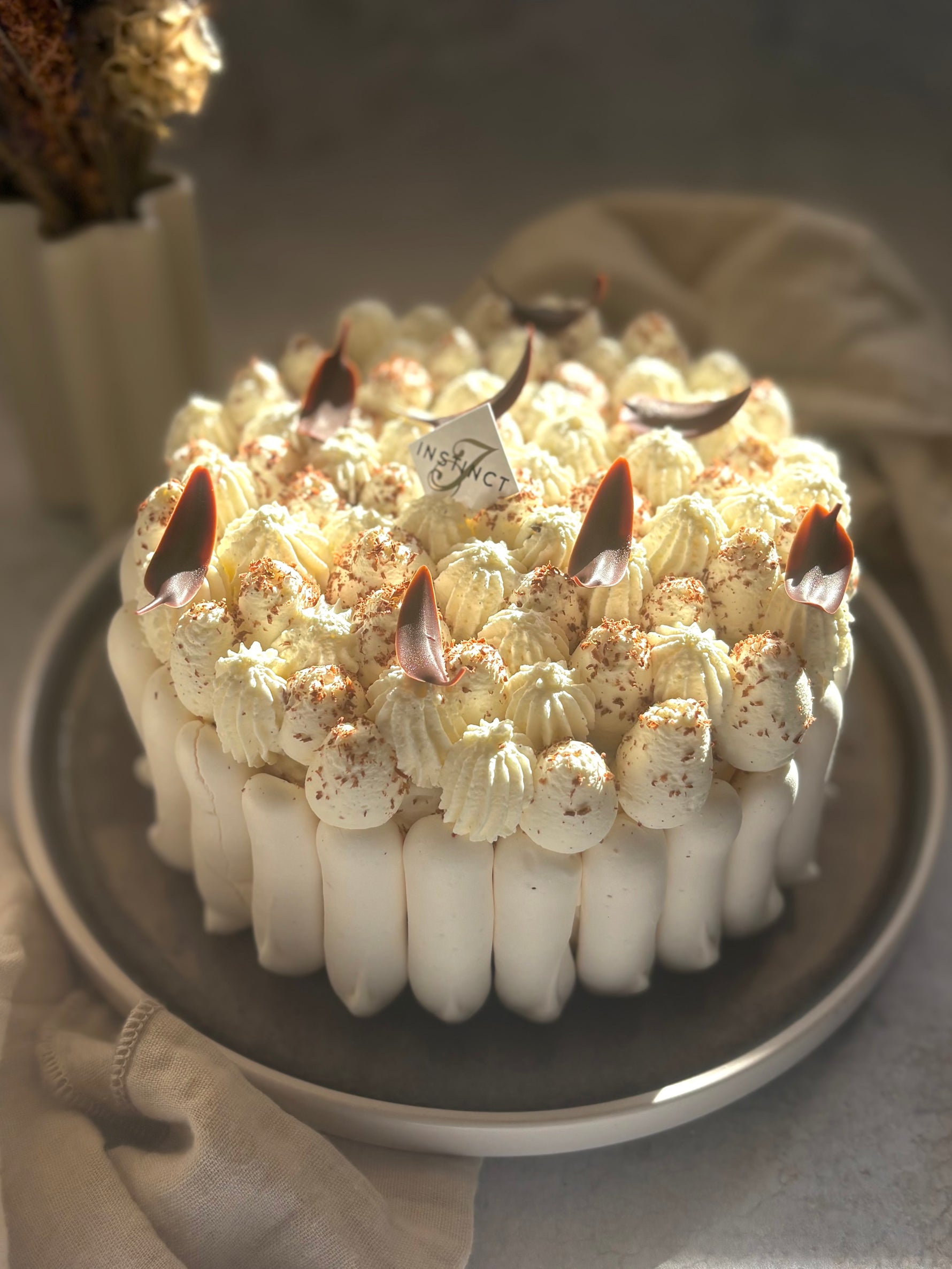 La chantilly à la vanille prolonge cette sensation aérienne et délicate, tandis que le chocolat noir râpé et les décors en chocolat ajoutent une fine touche croquante et une intensité supplémentaire en bouche.